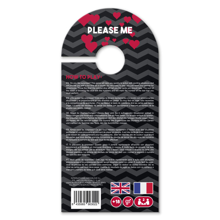 Do you like surprises? This game will quickly plunge you into action with exciting situations and provide a fun time for two. It's very easy to play; all you need is your adventure partner. Roll the dice! The colored die will tell you which cards to draw. The sum of the dice rolls will determine the number of the challenge you must take.