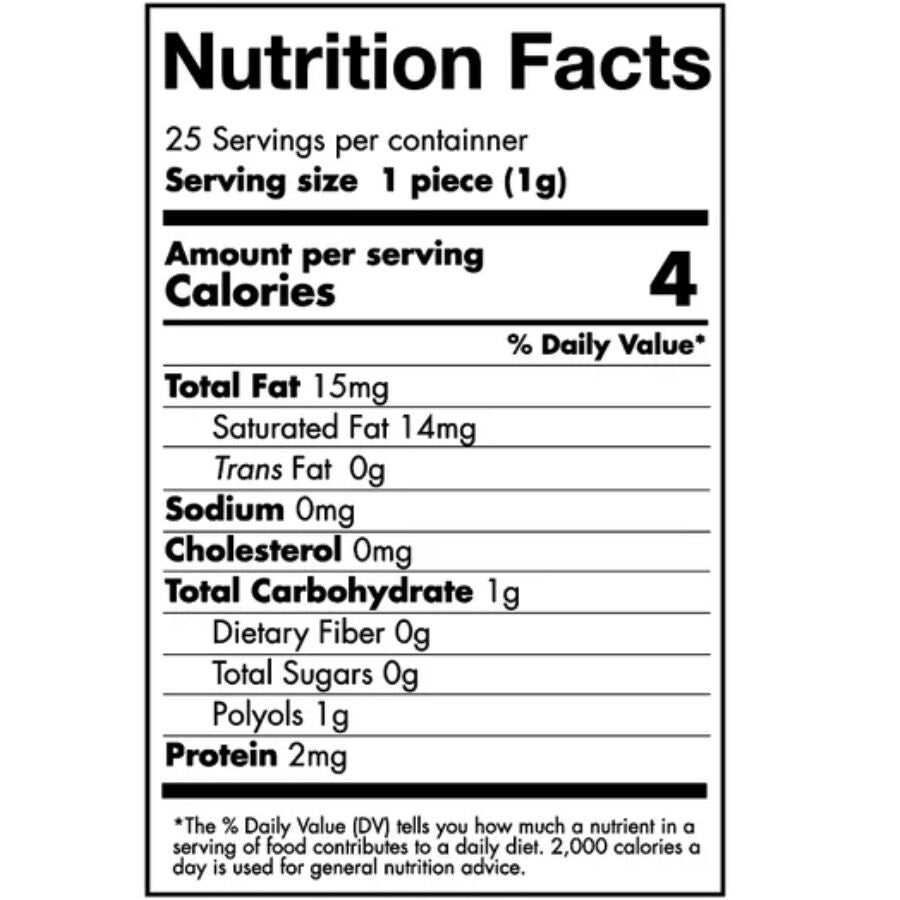 DATOS NUTRICIONALES: Porción/Caramelo (1g). Energía por cada 100g: 1680kj/400kcal; grasas 1,5g de las cuales: saturadas, 1,4g; hidratos de carbono, 97,2g de los cuales: azúcares, 0g; polioles, 97,2g; fibra 0,9g; proteínas, 0,2g.
