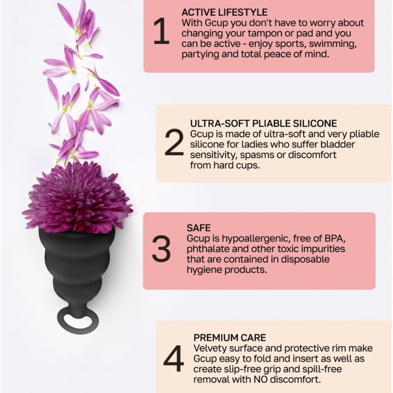 The Gcup menstrual cup is bell-shaped. Its main advantage is the internal check valve. Thanks to this valve, menstrual fluid doesn't flow back into the vagina, even during an active lifestyle. You can go about your daily activities, play sports, and even swim, completely forgetting about your period. The Gcup has a smooth, soft surface and is the perfect size to avoid discomfort. Furthermore, it offers significant savings compared to traditional sanitary pads and tampons. The Gcup menstrual cup is completely safe for women's health.