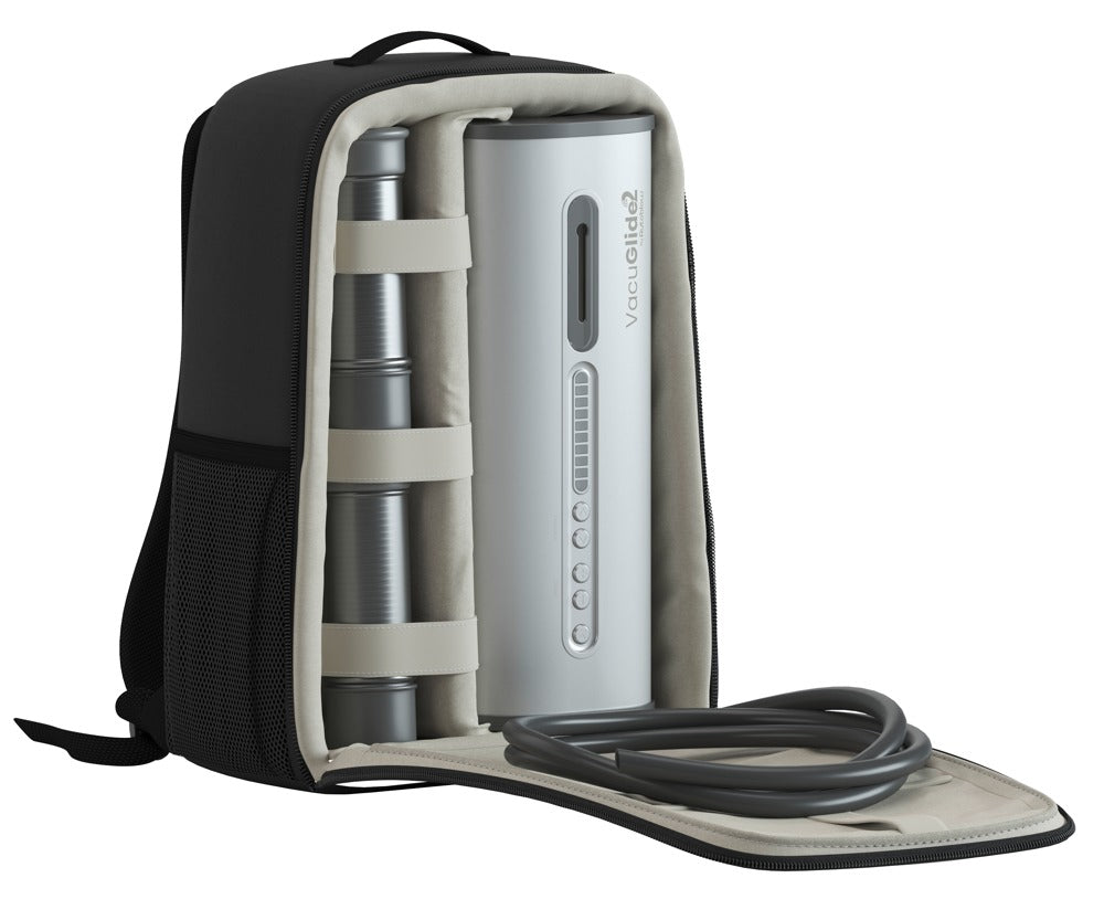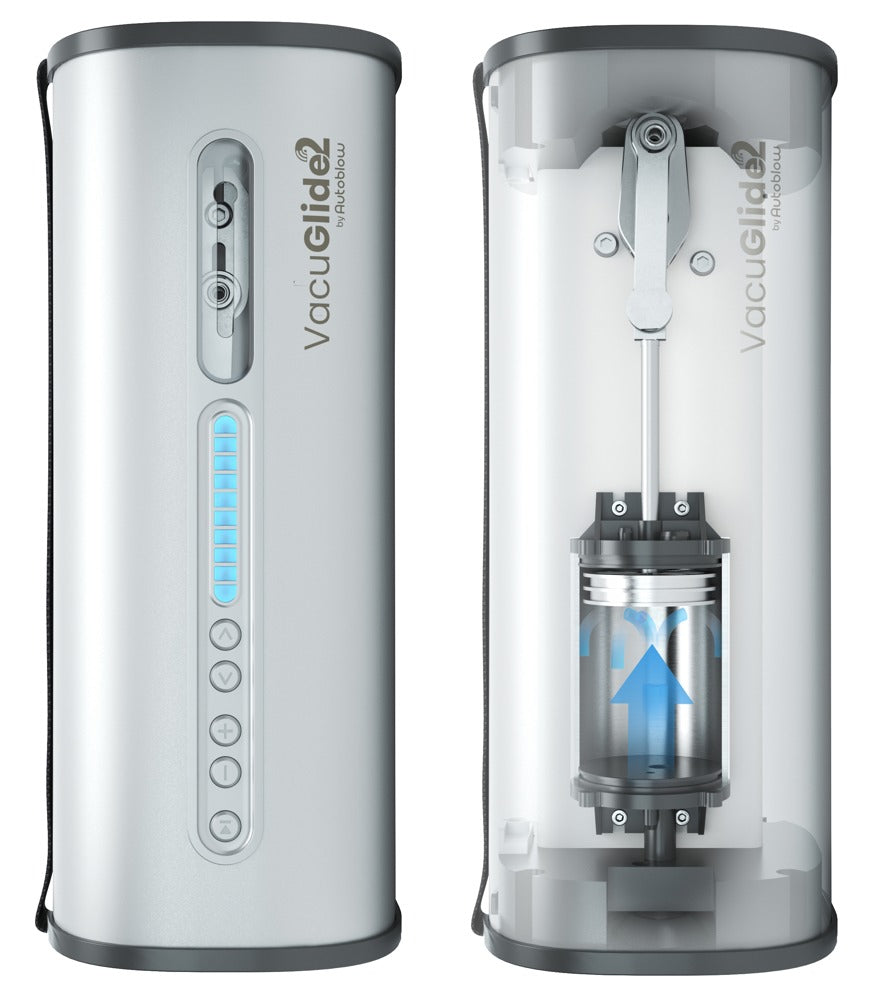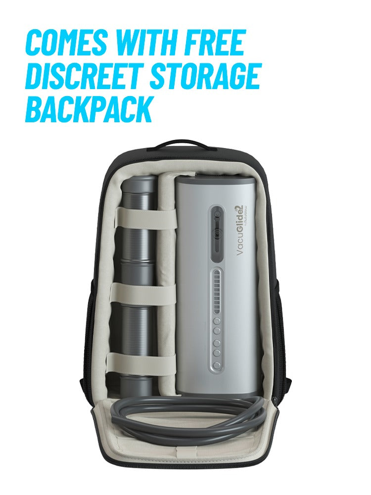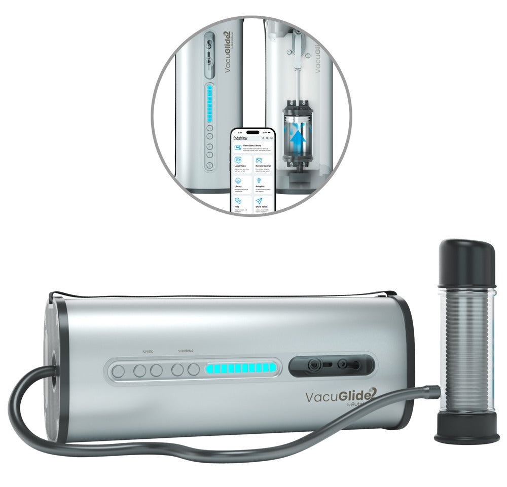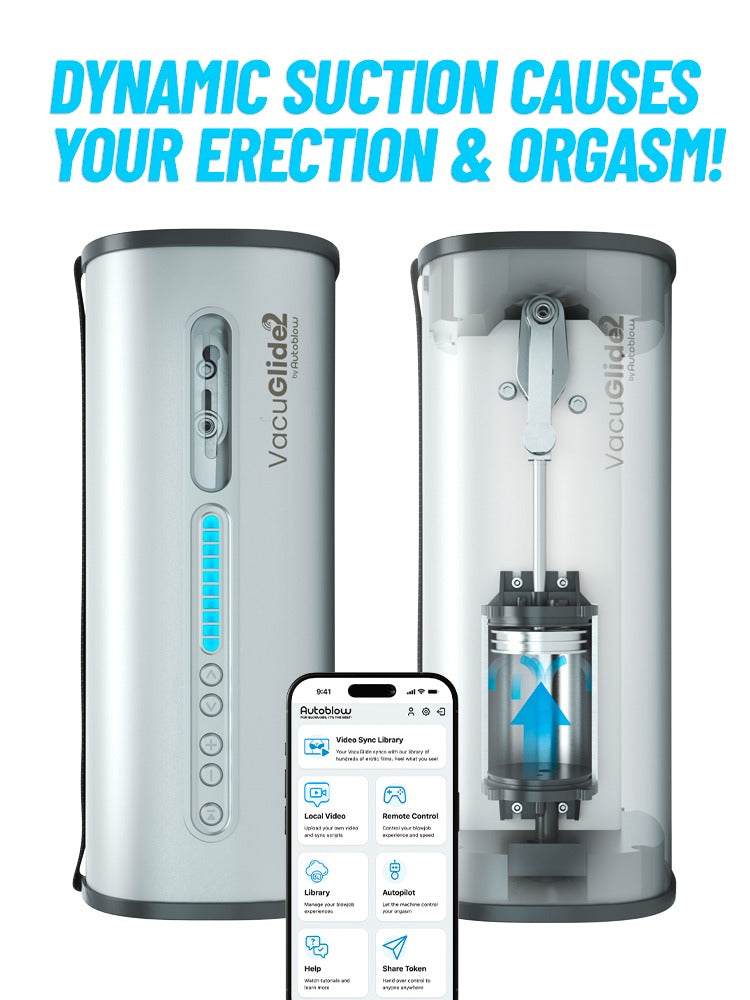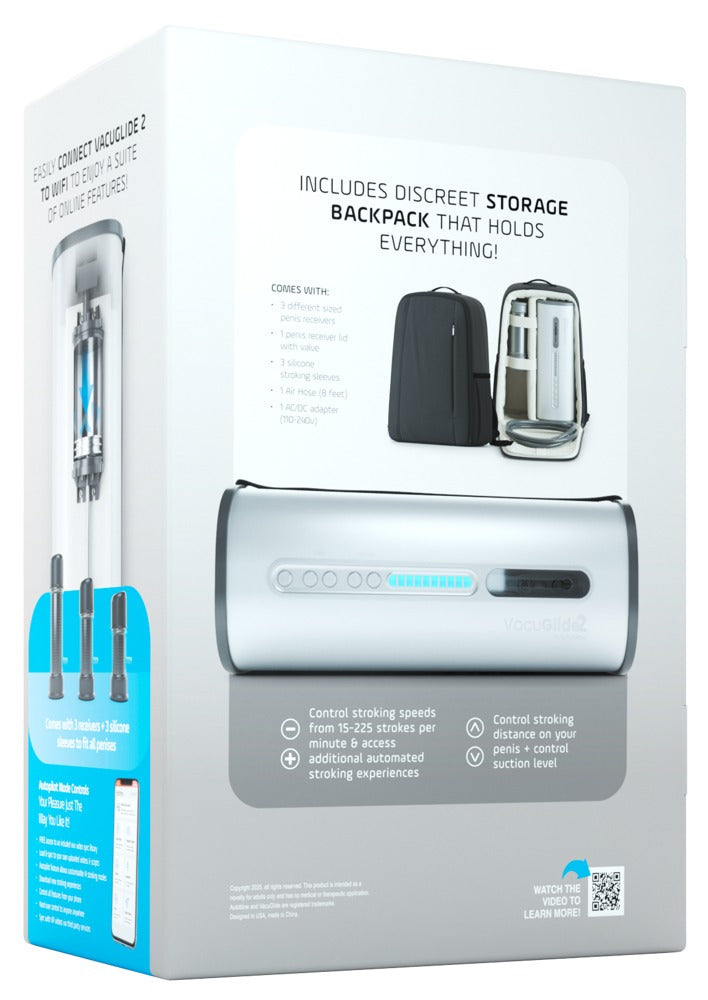The fully automatic handjob & blowjob now also via the app! The whisper-quiet VacuGlide 2 masturbator from Autoblow combines vacuum-assisted gripping and sliding movements with powerful suction (Milking Machine). For the perfect penis massage with excitingly realistic blowjob sensations. Fully automatic – just sit back and enjoy! The functions can be easily controlled at the push of a button (with an LED light) directly on the stylish and sturdy aluminium device. It has the right intensity and speed for every desire, thanks to its 25–200 suction impulses per minute and a manually adjustable stroker function. The VacuGlide 2 can now be controlled via an app and synchronised with videos! It offers access to over 1000 free VR videos – conveniently via a smartphone, tablet or laptop. In addition to that, the VacuGlide 2 can access a range of web-enabled features free of charge – such as remote control, downloadable blowjob experiences, custom autopilot modes, an AI companion for chatting and control, 20 built-in speeds and new handjob/blowjob modes (from extremely slow caresses to top turbo speed). The masturbator can be plugged into any socket (120–240 V) for reliable, non-stop power! The textured inner sleeve can be removed from the case for cleaning. 3 cylinders and silicone sleeves in different sizes are included. They can be swapped easily. There is therefore a perfect size for every penis! A discreet storage backpack is also included. Aluminium. silicone.