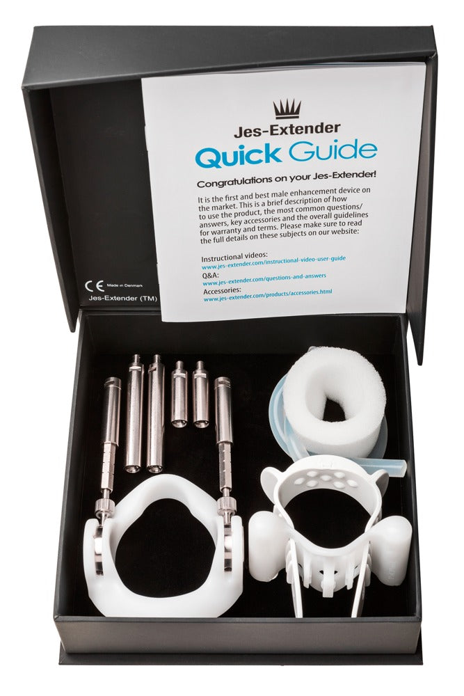 The beginner set for lengthening the penis in a gentle way! The Penis-Expander-Set Light from Jes-Extender is for lengthening the penis in a pain-free way with long-lasting success. It works effectively on the principle of gentle and permanent stretching to stimulate tissue cell production. The increase affects both the length and girth of the penis. Wearing the Expander regularly can also increase the ability to have an erection and an orgasm. It is comfortable to wear and it can be worn discreetly underneath clothes. It doesn't get in the way when a person is sitting or moving about/doing sport either. The high-quality penis expander has been designed, patented and handmade in Denmark. It is suitable for penis sizes up to 17 cm. It is quick and easy to assemble. It can also be adjusted so that it can fit the wearer properly. Everything that is needed to start the penis' stretching training straight away is included in the beautiful black box: 1 x Base unit 1 x Dual function front piece 1 x Silicone tube 1 x Comfort strap 1 x Protection pad 2 x 1 inch/2.5 cm Elongation sticks 2 x 2 inch/5 cm Elongation bars 1 x Jes-Extender Quick Guide and access to online video explanation. 1 year warranty and 100% money-back guarantee! Brass, nitin, POM.