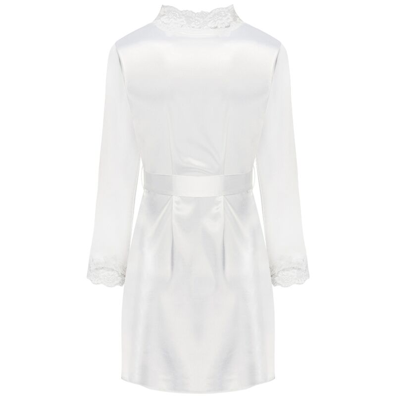 Un conjunto de ropa interior excepcionalmente hermoso hecho de satén crudo brillante, una bata de baño con camisola que llega hasta la mitad del muslo. La parte delantera y las mangas largas de la bata, atadas a la cintura con un cinturón, están decoradas con un bonito encaje. Camiseta de tirantes finos ajustables, decorada con el mismo encaje en el busto. Tanga incluida.