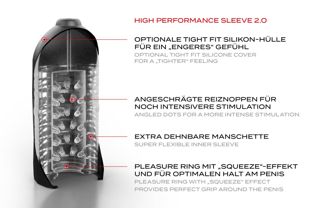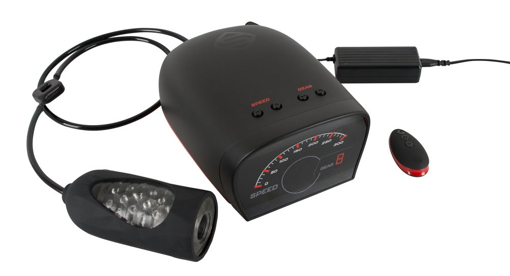The systematic further development of the first Suck-O-Mat! Mains-powered masturbator in a sporty and elegant design with LED speedometer display. The new model is 100% more powerful than its predecessor and the motor, with a power of 60 W, now offers up to 200 suction impulses per minute. The Suck-O-Mat 2.0 also stands out because of its extremely realistic and one-of-a-kind blowjob simulation. It can be enjoyed hands-free and – similar to a car – in 8 + 1 different gears: 1st gear: manually operated suction mode in 6 speeds. 2nd –9th gear: 8 fully-automatic suction modes with unpredictable interval patterns for a completely random and realistic blowjob feeling. The user can interfere with the preset patterns at any time to adjust the speed individually. This comes in handy when one wants to orgasm quickly or delay the climax a bit to enjoy the sensation even longer. The SUCK-O-MAT 2.0 then automatically changes to the 1. (manual) gear and keeps the desired speed until the happy ending. The sleeve has also been optimised for the Suck-O-Mat 2.0: It now has stimulating nubs on the inside and can be combined with the included Tight Fit cover to increase the grip around the penis and to let the stimulation reach new heights. Comes with a remote control, car adapter and a black filter. Also includes an AC power adapter 230V European plug, output 12V. 5V USB port. Complete length 26.3 cm, penetration depth 11 cm, length sleeve 15.7 cm, Ø 2.5 cm (flexible). ABS, PVC, TPE, PP.