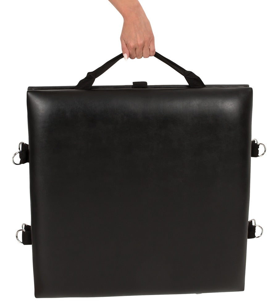 For captivating experiences - anytime and anywhere! With the bondage board there is almost no limitation to living out your erotic fantasies. The black bondage board is foldable and requires hardly any space at home. It has a travel-friendly carrying strap for easy transportation and allows for punishment at every desired location. The only thing needed is a bit of space to set it up. The bondage board includes various accessories that leave nothing to be desired: it is equipped with wrist and ankle cuffs (4 of each) and a choker - all restraints can be fixed anywhere on the board with the snap hooks. The fun package is rounded off by a ball gag, a flogger and a blindfold. For thrilling fun and limitless sexual fantasies! Bondage board with 2 small boards 60 x 60 cm (unfolded 120 cm), includes 4 padded wrist cuffs (39 cm long, 6 cm wide), 4 padded ankle cuffs (56 cm long, 6 cm wide), 1 choker (5.5 cm high) and 1 ball gag (Ø 4.1 cm) with an adjustable strap. The flogger is 38 cm long. The blindfold has a stretchy strap. Weight of the board 7.1 kg. Padding of the board: 5.5 cm high. Polypropylene, polyester, TPE, PVC.