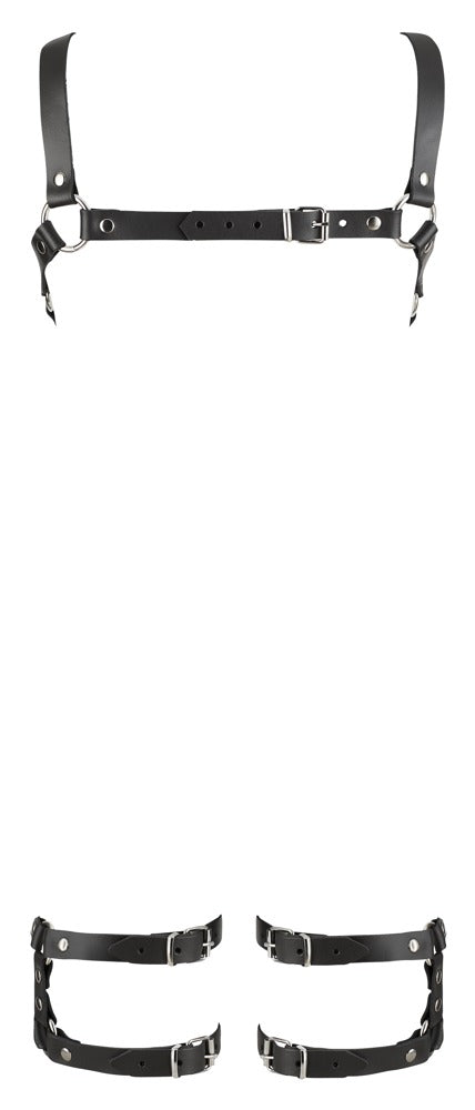 Perfect for hot bondage games! The chest harness with removable thigh straps that can be easily undone with the snap hooks. Split leather (cow, chrome-free tanned), polyurethane coating, metal.