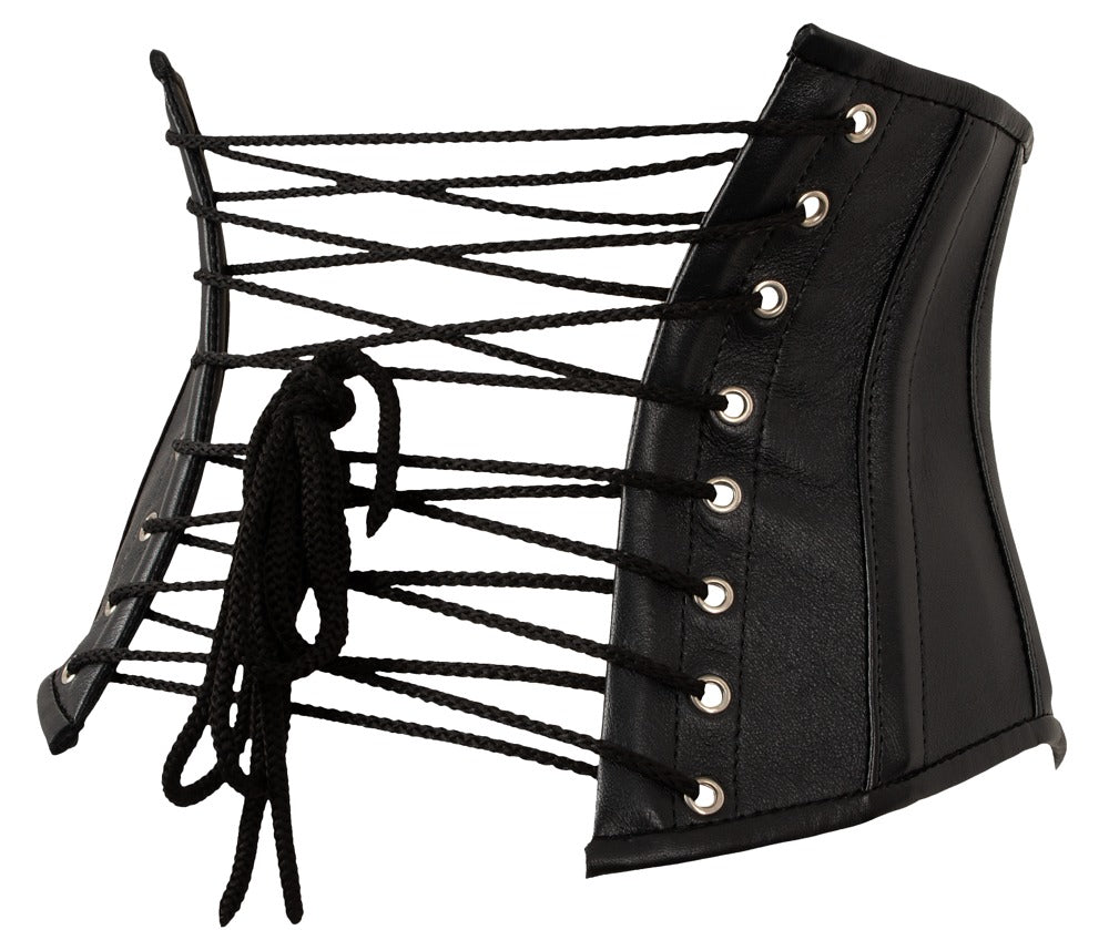 Waist reduction and leather fetish fun! Black waist cincher made out of lamb nappa leather. The waist cincher has a zip at the front and lacing at the back. The bones inside the waist cincher shape the waist. Perfect for a private rendezvous or for visiting a nightclub or swinger club. Leather (real leather, lamb nappa) chrome-free tanned; inner lining is made out of 100% cotton. Contains non-textile parts of animal origin.